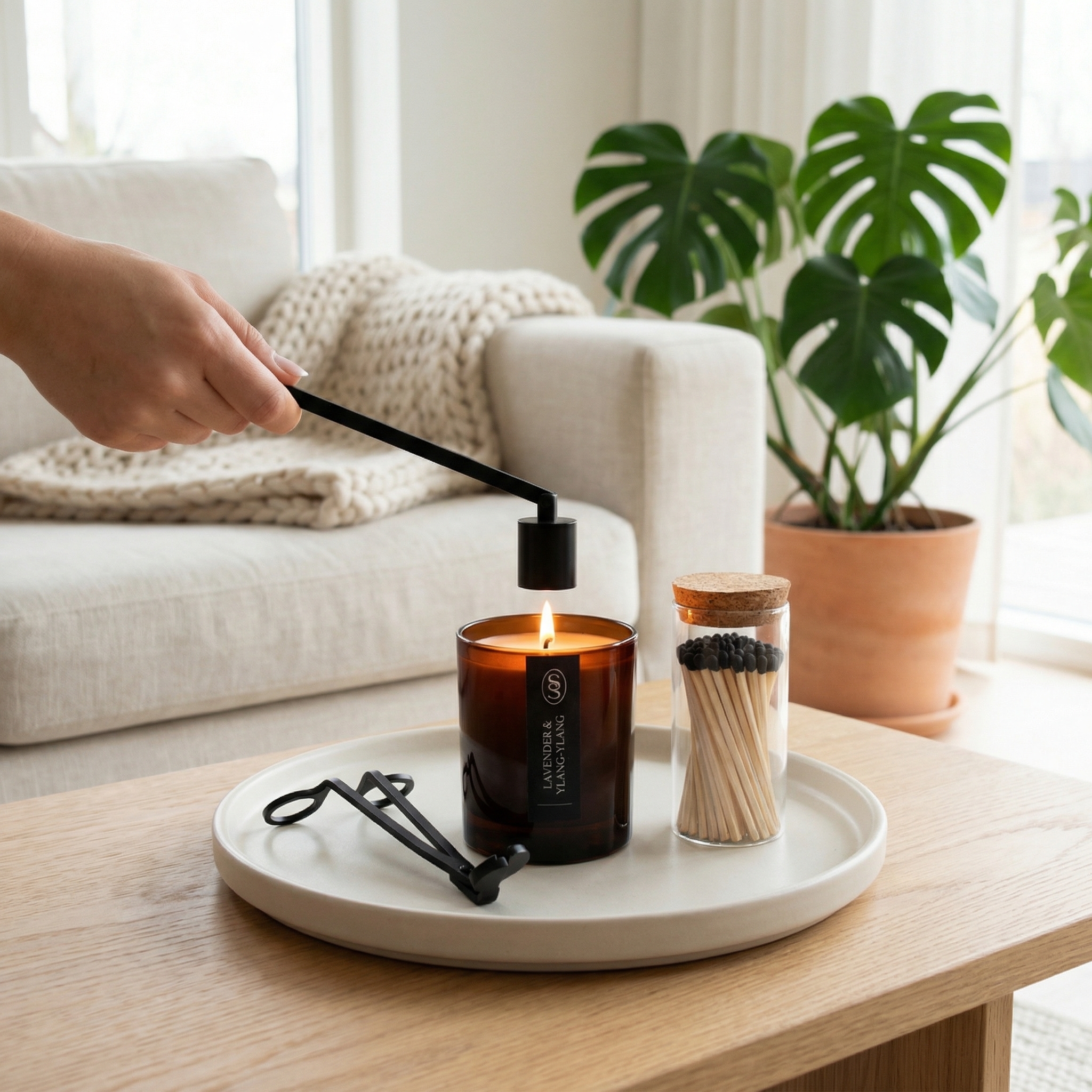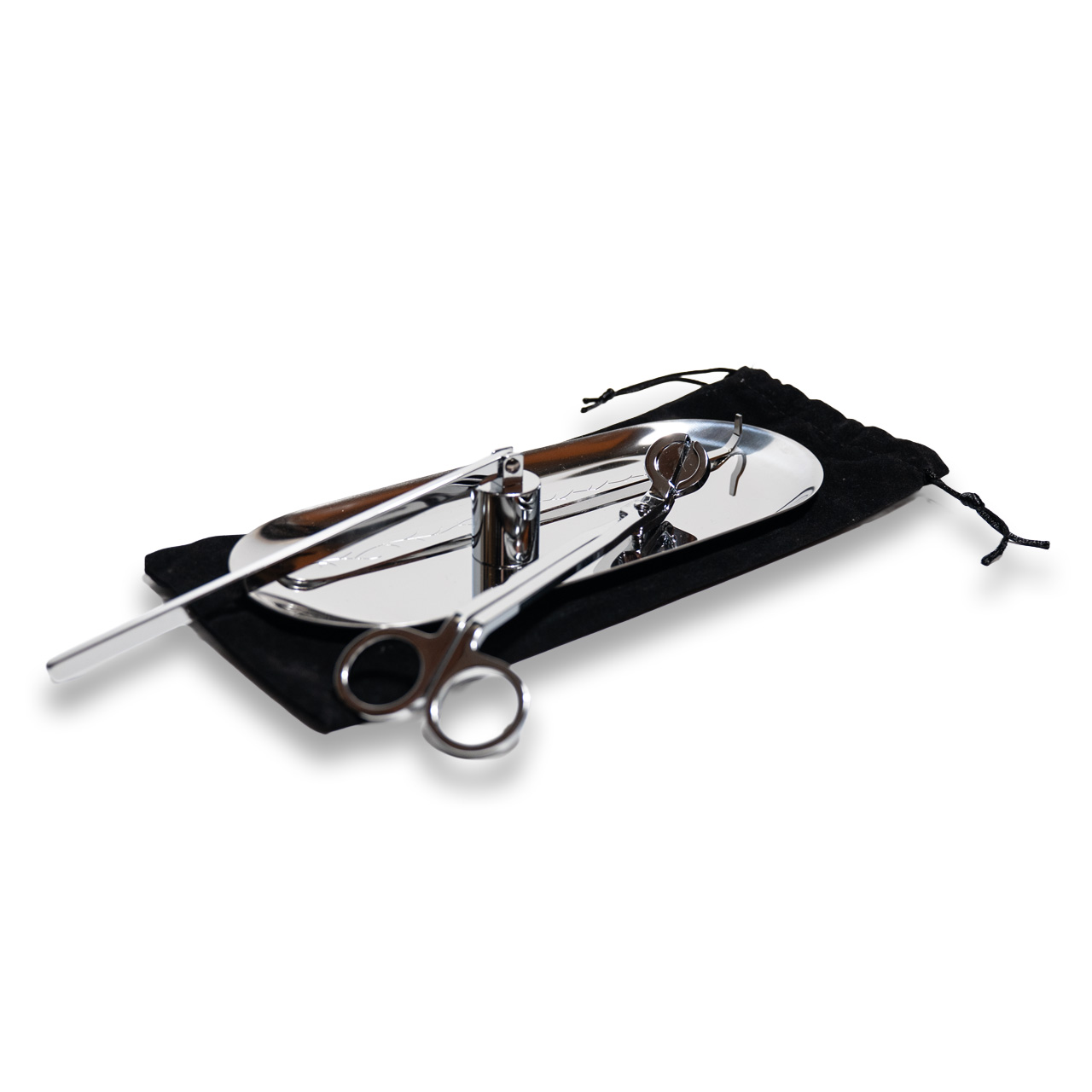 This essential candle care set includes a wick trimmer and snuffer, both of which are essential for improving the lifespan and scent throw of your candles. Plus, they make great styling accessories too! Select either matte black or silver colour setting.Safety Information
